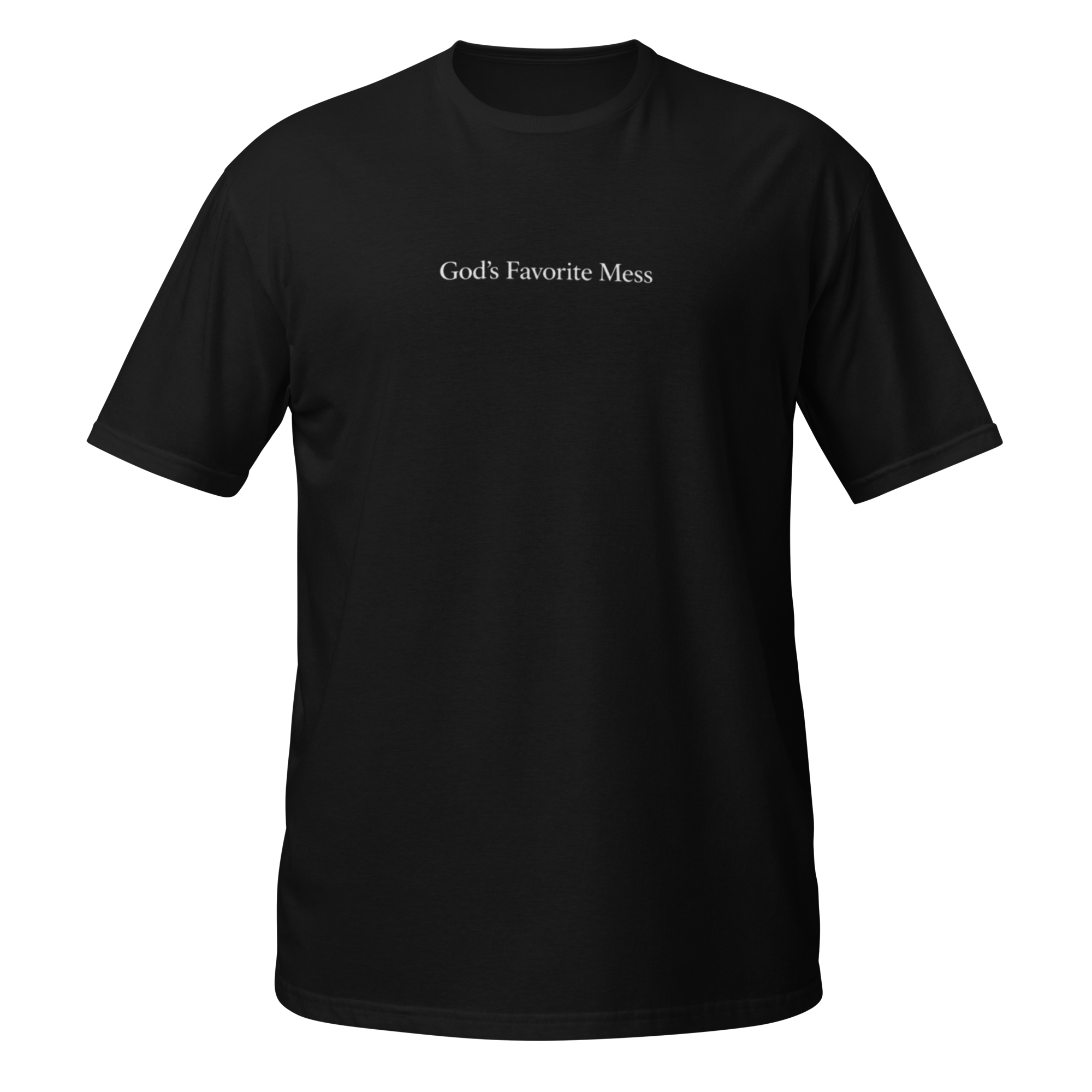 Black Unisex short-sleeve t-shirt with a classic fit. Made from soft, breathable fabric for everyday comfort. Features the bold God's Favorite Mess statement for effortless every day style.