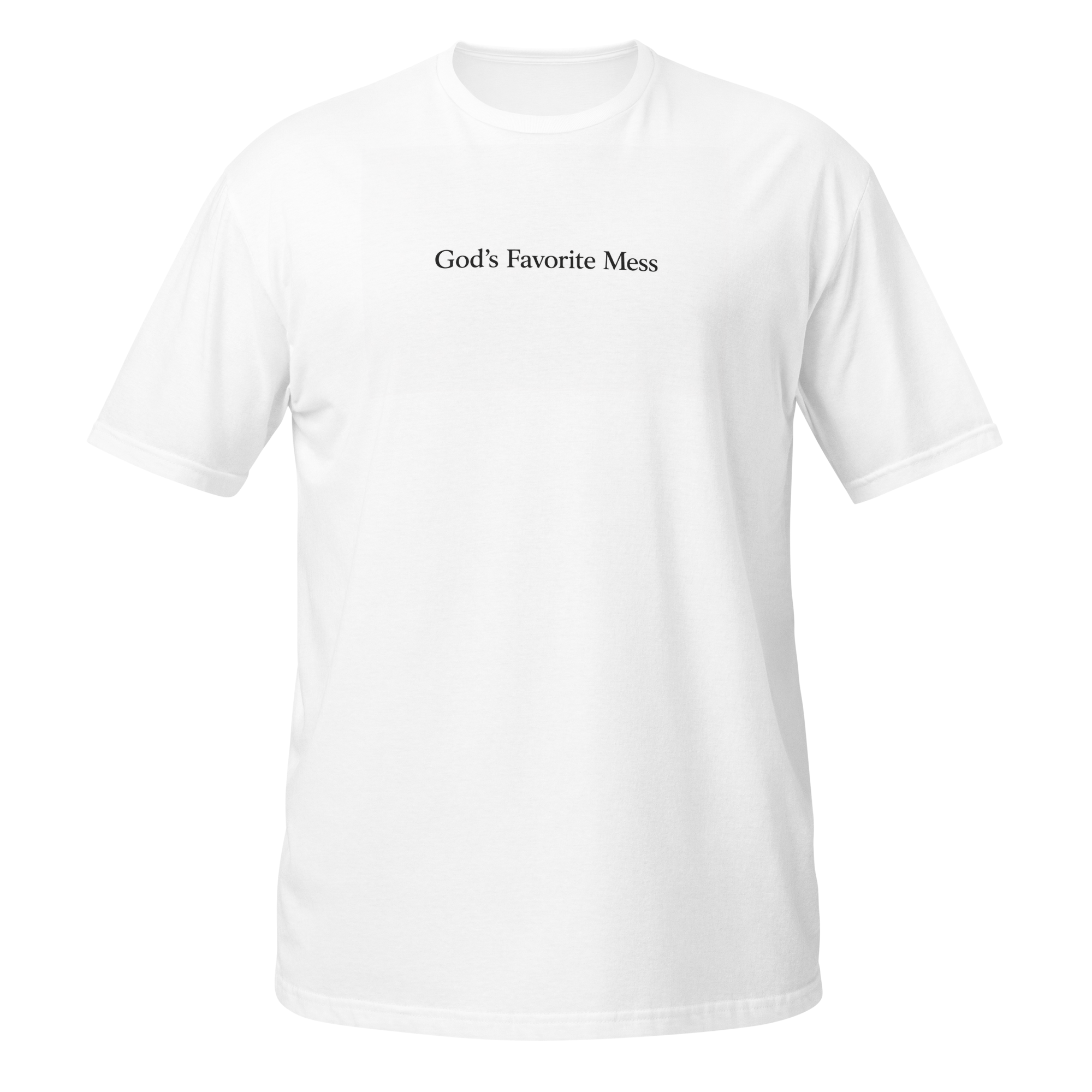White Unisex short-sleeve t-shirt with a classic fit. Made from soft, breathable fabric for everyday comfort. Features the bold God's Favorite Mess statement for effortless every day style.